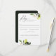 Limões botânicos de cor aquosa elegantes, folhas e flores, cartões RSVP de casamento com nota de alergia à comida. A parte traseira da carta apresenta cor verde-escura sólida.