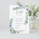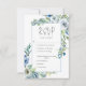 Lindas flores de peônia brancas e folhas em aquarela verde formam uma bela moldura neste cartão de confirmação de presença para casamento floral azul com opções de refeição. Um cartão de resposta moderno e sofisticado para um casamento em jardim ao ar livre. Linda borda