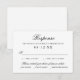 Complete sua suíte com este cartão de RSVP de casamento com elegante script e tipografia serif refinada em um layout limpo preto e branco. Inclui espaço para nome do convidado, seleção de presença e uma seção conveniente de escolha de refeição. Mínimo, atemporal e perfeito para casamentos formais, tradicionais ou clássicos modernos.
