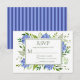 Este cartão de RSVP encantador e elegante com belas, tênues e multicoloridas hortênsias azuis e folhagens verdes deslumbrantes e verso listrado em azul combinando é perfeito para ser enviado junto com seus convites. Seus convidados acharão fácil responder ao seu chá de noivado. Você pode facilmente personalizá-lo selecionando "Personalizar este modelo" e digitando a data limite para resposta. Em segundos você verá seus cartões de RSVP únicos e deslumbrantes!