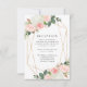 Na moda, cartões elegantes de cerimônias de casamento, com detalhes de sua recepção de casamento cercados por uma estrutura geométrica de ouro sujo, enfeitiçada com buquês de cor-de-água rosa pincelada e tulipas com folhas verdes e de cobre. Personalize a placa adicionando informações importantes, como local de recepção, horários, etc.