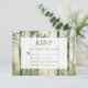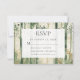 Este elegante e moderno cartão RSVP de casamento apresenta um fundo de paisagem da floresta de cor d'água rústica em tons de verde e ouro O texto personalizável da cinza de carvão aparece em uma tela branca retangular. A cena da floresta é repetida no verso da carta.