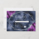 Este elegante cartão RSVP de casamento apresenta um quadro geométrico prateado decorado com buquês florais roxos e prateados num fundo azul marinho de folha falsa. O texto personalizável combina a escrita manual de cinzas prateadas e as fontes de impressão. A imagem da folha azul é repetida no verso.
