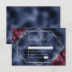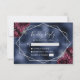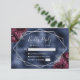 Este elegante cartão RSVP de casamento apresenta um quadro geométrico de prata decorado com buquês florais de burgundy e prata num fundo azul de folha azul marinho. O texto personalizável combina a escrita manual de cinzas prateadas e as fontes de impressão. A imagem da folha azul é repetida no verso.