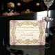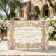 Transporte seus convidados para um conto de fadas com este design inspirado no Rococó, apresentando floreios antigos e flores suaves. Perfeito para casamentos formais em jardins. Este design apresenta uma moldura Barroca simétrica e luxuosa em um tom amarelo-ouro antigo, adornada com intricados arabescos e filigranas. Aninhadas dentro das bordas estão rosas ilustradas à mão em tons de rosa suave e rosa poeirado, acentuadas por folhagens em verde-sage. Uma ilustração caprichosa de um querubim ancorada no topo da composição contra um fundo quente creme e marfim. O texto é apresentado em uma elegante caligrafia preta combinada com uma fonte serifada clássica para legibilidade. Esta é uma imagem impressa plana com efeito de Folha de Ouro Falso, não metal elevado ou estampagem a quente real.