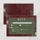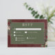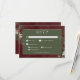 Apresentamos nosso encantador cartão de resposta de casamento de inverno com opções de jantar, onde a elegância atemporal encontra a beleza da estação. O rico fundo burgundy, artisticamente envelhecido com sotaques suaves em branco, define um tom cativante para o seu dia especial. Na área de texto em verde escuro salgueiro, os detalhes do seu casamento brilharão, cercados por uma delicada moldura creme que adiciona um toque de refinamento. Abrace o espírito do inverno com uma moldura impressionante de folhagem verde exuberante, apresentando azevinho adornado com bagas vermelhas ricas, visco com suas delicadas bagas brancas e o charme atemporal do pinheiro verde. Este design inspirado no mundo encantado do inverno captura a essência da estação e convida seus convidados a celebrar seu amor em um ambiente que exala graça natural e charme festivo. Com este design, você certamente preparará o cenário para uma celebração repleta de amor e alegria. Abrace a magia do inverno e deixe que seu casamento seja um reflexo da beleza que esta estação traz. Este cartão faz parte da suíte de casamento Rustic Winter Berries