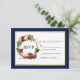 Cartão de confirmação de presença de casamento de guirlanda de madeira com uvas e videiras em aquarela moderna e elegante inclui rosas burgundy, rosas cor-de-rosa, rosas vermelhas e folhagens botânicas. Fundo azul com moldura dourada.
