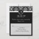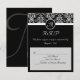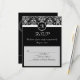 Fundo preto elegante com selo inicial monograma preto e branco, cartões de resposta correspondentes para o convite de casamento. Acento damasco fresco e elegante, este convite tem uma orientação vertical. Personalize online com os detalhes do seu casamento.
