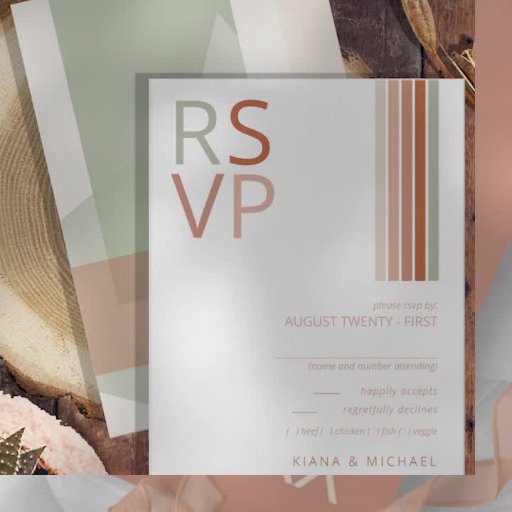 As linhas geométricas da Retro 70 receberam um facelift com fundo bloqueado por cores e esquema de cores contemporâneo, para criar os pedaços desse sorteio de design de casamento. A paleta colorida vai desde a laranja queimada até os tons de terra cotta e a verde-sábio para dar a esse conjunto uma vibração bem tendenciosa. A placa RSVP de casamento mostrada aqui apresenta todas as informações acima, além de uma modelo para adicionar facilmente seus próprios nomes e opções de menu. Procure ID983 para ver todas as peças de coordenação neste conjunto.