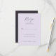 This elegant wedding RSVP card features a soft lavender background with sophisticated black script typography, creating an air of timeless elegance. The minimalist design focuses on clean lines and ample space for personalization, making it perfect for couples aiming to convey a refined and classic aesthetic. With its simple yet graceful style, this card is ideal for those planning a romantic or traditional wedding celebration. Its understated charm ensures that the focus remains on your special day while providing all necessary details in a tasteful manner.