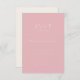 This elegant wedding RSVP card features a soft pink background with minimalist typography, creating an understated yet sophisticated look. The clean lines and simple design emphasize a modern and timeless aesthetic, perfect for couples who prefer a subtle touch of romance in their stationery. With space to indicate acceptance or regret, it invites guests to respond gracefully while maintaining the overall charm of your special day. Its simplicity ensures it complements any wedding theme, making it versatile for various celebrations.