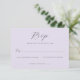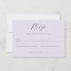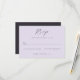 This elegant wedding RSVP card features a soft lavender background with sophisticated black script typography, creating an air of timeless elegance. The minimalist design includes space for personalization and clear checkboxes to indicate attendance preferences, making it both functional and stylish. Perfect for couples aiming for a classic yet modern aesthetic, this card captures the joyous anticipation of a special celebration while maintaining a refined tone. Its simple yet graceful layout ensures that your guests feel welcomed and valued as they respond to your invitation.
