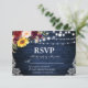 As Luzes de Corda de Madeira Azul Rústica Lace Aquarela Placa RSVP de Casamento Floral inclui rosas de marsala burgundy, rosas cor-de-rosa, rosas vermelhas, girassóis e verde botânico.