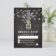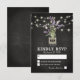 Cartões de resposta de casamento country chic com um fundo de quadro-negro de giz preto rústico, luzes de corda, um jarro de pedreiro com flores de lavanda roxa, envolto em aniagem com as iniciais do casal e um modelo de RSVP de casamento facilmente personalizável.