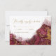 Um fundo de abstrato que lembra o mármore em tons de burgundy veinados com ouro reluzente é o pano de fundo para textos elegantes e layouts modernos de design nos pedaços desta bela suíte de casamento. O RSVP de casamento mostrado aqui apresenta o texto acima mais o texto de script de fluxo opcional de 'Resposta Rápida' e um modelo para adicionar seus detalhes de resposta. Procure ID644 para ver todas as peças de coordenação neste conjunto.