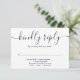 Um cartão RSVP na moda com seus detalhes definidos em tipografia química e personalizado com seus nomes, folhagem floral desenhada à mão e luzes de cordas em um fundo azul marinho no reverso. Projetado por Thisnotme©