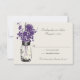 Correspondente ao cartão RSVP para um chá de panela estilo country ou talvez você apenas ame Mason Jars! Vintage Mason Jar pendurado num gancho com flores selvagens do campo. Uma maravilhosa cor de fundo creme com desenho preto de um Mason Jar repleto de flores silvestres cor roxa (2627). Se você tiver alguma dúvida sobre este design ou quiser mudar de cor, envie um email para paula@labellarue.com