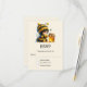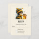 Placa RSVP com uma imagem fofa. Uma garota com uma fantasia de abelha em crochê com uma abelha ao lado dela. Vendo um pote de mel.