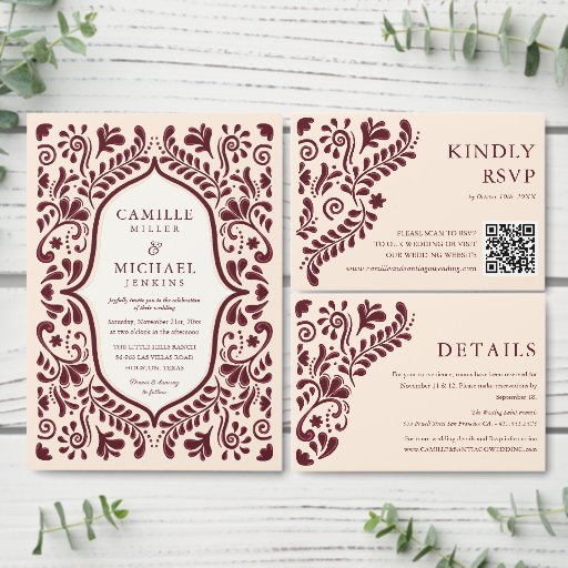 Cartão RSVP Mexican Burgundy Wedding QR Code