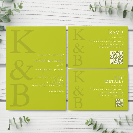 Create your own personalized wedding RSVP cards featuring modern monogram typography and minimalist graphic design in chartreuse color.
