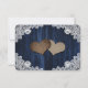 This navy blue and sunflower RSVP card featuring sunflower flowers on a rustic wood background adorned with white floral lace, burlap hearts and string lights is perfect for inviting your guests to your navy blue rustic wedding party inspired by sunflower flowers.