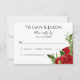 A adição da placa RSVP à coleção Lovely Red inclui um fundo preto sólido. A frente tem uma fonte preta e um arranjo floral vermelho em um fundo branco para o cartão de resposta.