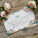 This Nuestra Boda Flowers Botanical Spanish Wedding RSVP Card design showcases a rich and vibrant floral arrangement around the edges, with bold colors like red, orange, blue, purple, and yellow that create a festive and welcoming feel. The flowers are intricately combined with leafy patterns and small, detailed embellishments, giving the design a lively and textured look. The balance of bright, contrasting colors and the delicate, symmetrical arrangement make this an eye-catching option for a celebratory wedding stationery, especially one with a traditional or folkloric theme.