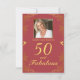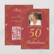 Celebre aniversários marcantes como um Fabuloso 50º Aniversário com este rico design vermelho e dourado que apresenta uma bela foto, detalhes elegantes de folhas, delicados acentos de beija-flor e texto personalizável. Perfeito para convites, cartões de felicitações, papel de presente, bem como itens essenciais para festa de aniversário, como faixas e pratos de papel. Este design irá adicionar um toque notável, quente e elegante à sua celebração especial. Para suporte ou perguntas de personalização, entre em contato com remidevandesigns@gmail.com. RemideVan©