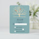 Cartão RSVP com um fundo verde suave sobreposto no topo é uma árvore amarela clara com 2 silhuetas de pássaros laranja sentados nos galhos.