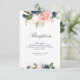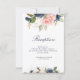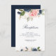 Um design floral com lindas pincéis cor-de-rosa e flores azuis marinhos de aquarela. Este cartão é para informações de recepção de casamento. A cor do marinho Elegante pode ser personalizada. Todo texto pode ser editado para texto, tamanho, tipo de fonte, cor e posicionamento.