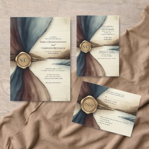 Invite guests to respond in style with this matching RSVP card from the Plum and Blue Ombre collection. Featuring mocha and slate-blue ribbons meeting under a gold wax-style seal, this design captures the balance of artistry and romance. The soft painterly background complements your invitation suite with sophisticated charm.
