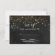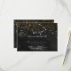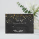 Este convite de casamento elegante e moderno tem um fundo de aquarela preta com uma dispersão de brilhos dourados falsos caindo do topo e texto branco.