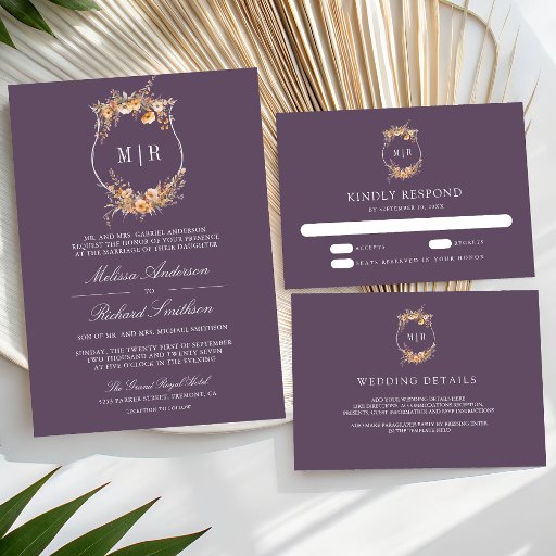 Cartão RSVP Queda Autumn Wildflower Crest Dusty Purple Casamen