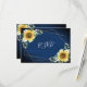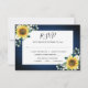 Essas placas RSVP apresentam um design floral de cor d'água com girassóis, flores brancas e folhagem com uma falso estrutura geométrica dourada. O fundo é um padrão marinho de grãos de madeira azul. Personalize com seu encontro. Estes cartões fazem parte de uma coleção que inclui uma série de artigos de papelaria de casamento e outros artigos de casamento. Visualize a página de coleta ou visite nossa loja para ver o intervalo de cheios.