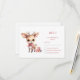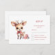 Cartão RSVP com uma ilustração de um adorável veado bebê. Olhos grandes orelhas com cabeça grande e pequenos galhos castanhos. Vestindo um grande arco vermelho. Ao lado de uma pilha de presentes.
