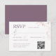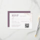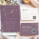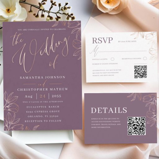 Complete your wedding suite with this elegant RSVP card featuring a dusty plum background and coordinating blush and rose gold typography. Designed with a clean, modern layout, it includes space for guest responses, attendance details, and a convenient QR code option for online RSVPs. Subtle botanical line art adds a romantic touch, while the matching monogram back ensures a polished, cohesive finish—perfect for sophisticated, modern weddings.