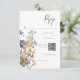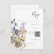 Este simples mas elegante cartão de resposta de casamento com design de código QR apresenta um buquê de cor d'água rústica de flores silvestres prateadas, amarelas, brancas e burgundy com verde. É parte da Rustic Meadow Wildflower Purple Watercolor Suite criada pela Simply Farmhouse Press.