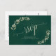 Estes bonitos cartões de RSVP de casamento verde esmeralda apresentam um design bicho boho com caligrafia e pinturas manuais de folhas de aquarela em tons de verde sábio. O verso é um formulário para os convidados preencherem e retornarem indicando se irão comparecer, o número de convidados que irão trazer e a escolha das refeições. Também há espaço para o URL do seu site para que seus convidados possam responder online se isso for mais fácil para eles.