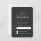 Uma placa RSVP projetada com uma ilustração dourada em um fundo de cinza preta. Projetado com uma ilustração de uma montanha com raios solares brilhando por trás. A tipografia diz: Aventura.