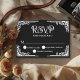 A matching RSVP card designed in the Cinematic Vintage style and white and black with subtle filmgrain/dust overlay. Completes your editorial wedding suite with a cohesive, nostalgic look. Fully editable. The card has a decorative frame and vintage font in white on a black background.