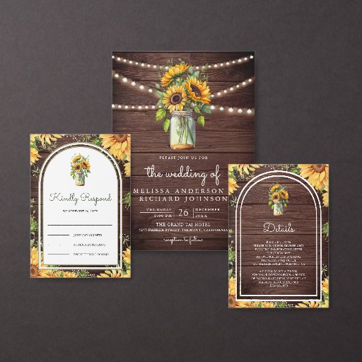 Cartão RSVP Wood Sunflowers Mason Jar Arch Wedding