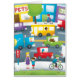 Artista: Marcus Cutler | ilustração de uma zona de ocupação urbana e ponto de ônibus com peões e carros, caminhões e compras e um rapaz de bicicleta