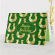 Cartão de aniversário de março em três dimensões. Ferraduras Douradas com pequenos trevos decoram a frente com o texto "Parabéns". Dentro, inclua sua escolha de saudação. A mensagem de exemplo é "Saúde aos 40 anos". Balões verdes no topo da dentro adicionam ao tema festivo do partido. O maior cartão é perfeito para assinaturas de grupo.