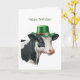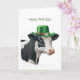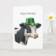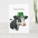 Cartão de saudação de aniversário com a ilustração aquosa de uma vaca negra e branca enfeitada num chapéu verde com banda de ouro e uma flor branca e camarões. Feliz saudação de terça-feira na frente. Dentro apresenta as saudações - Espero que seu dia seja fantástico. Feliz aniversário!