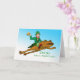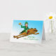 Saúde! Dia do Paddy. Rua, cartão de saudação do dia de Patrick com um duende segurando uma cerveja e cavalgando em um sapo. O sapo está voando através do céu azul claro. O duende está vestido com um terno verde, meias listradas, e veste um chapéu verde. Arte, imagem e direitos de autor versos © Shoaff Ballanger Studios, 2024.
