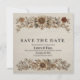 Esta imagem elegante é um cartão em estilo vintage com a frase "SALVE A DATA" em uma fonte serif simples. O texto é emoldurado por ilustrações detalhadas e desenhadas à mão de flores, folhas e grandes penas em tons terrosos. O design geral rústico e boêmio é perfeito para um convite de casamento ou evento especial. Preencha com seus detalhes para o seu dia especial.