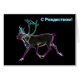 Uma renderização brilhante, semelhante a neon, de uma rena (Rangifer tarandus), também conhecida como rena. O texto cirílico que lê "S Rozhdestvom" (С Р ж д е т с в о мо - Uma saudação de Natal russa) aparece em azul e branco brilhantes.