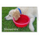 goldendoodle on grass by red water bowl for missing you