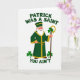 This greeting card shows a stylized Saint Patrick figure standing in the center on a bright white background, dressed in an emerald green robe with gold trim and a matching cap. He has a full white beard and a rosy nose, giving him a friendly, slightly teasing look that feels like an inside joke shared between close friends 💚. In one hand, he holds a slender shepherd’s crook with a gold curl that stands out against the green. Three green shamrocks float around him, spaced to the left and right like small accents that keep the scene light and balanced ☘️. Above the figure, green lettering curves in an arc reading “PATRICK WAS A SAINT.” Below him, more green text sits in a straight line reading “YOU AIN’T,” landing like a cheeky punchline. The greens and golds stay rich against the white space, with the shamrocks and crook curl echoing the same tones across the design. The robe’s folds, the gold edging, and the three shamrocks are the main details against the open white field.