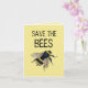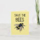 Ajude a salvar as abelhas! Estão a desaparecer a um ritmo alarmante. Na frente está uma imagem de uma abelha. Dentro é vazio para as suas notas/saudações e ambas as páginas têm cor amarela. Por trás estão informações sobre como ajudar a salvar as abelhas.